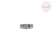 Embodying modern sophistication, this ring features a bold, polished band that commands attention. A brilliant, solitaire white Cubic Zirconia is elegantly secured in a geometric setting, creating a statement of quiet confidence. Expertly crafted from pure 92.5% silver, this piece is a testament to contemporary design and timeless appeal.